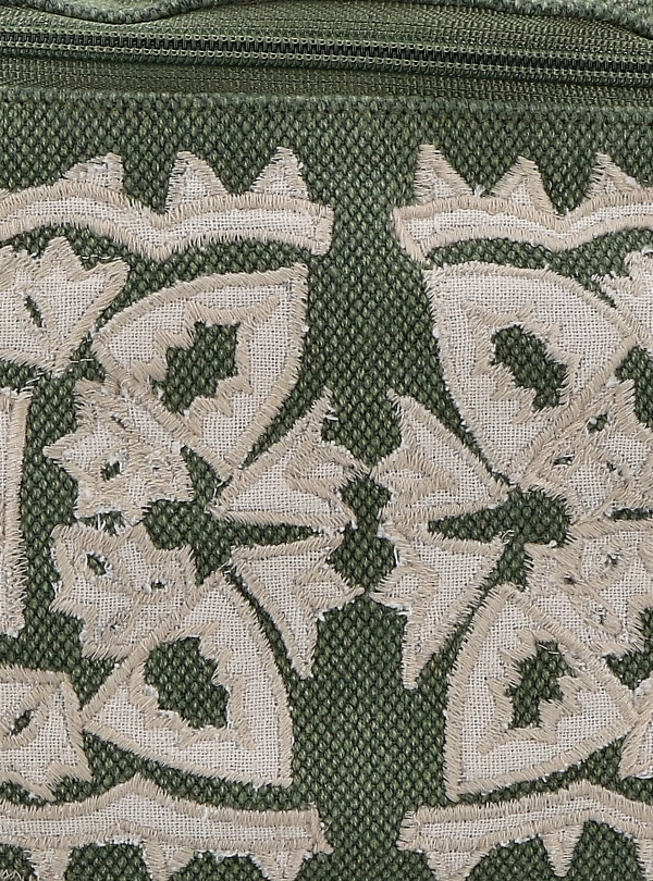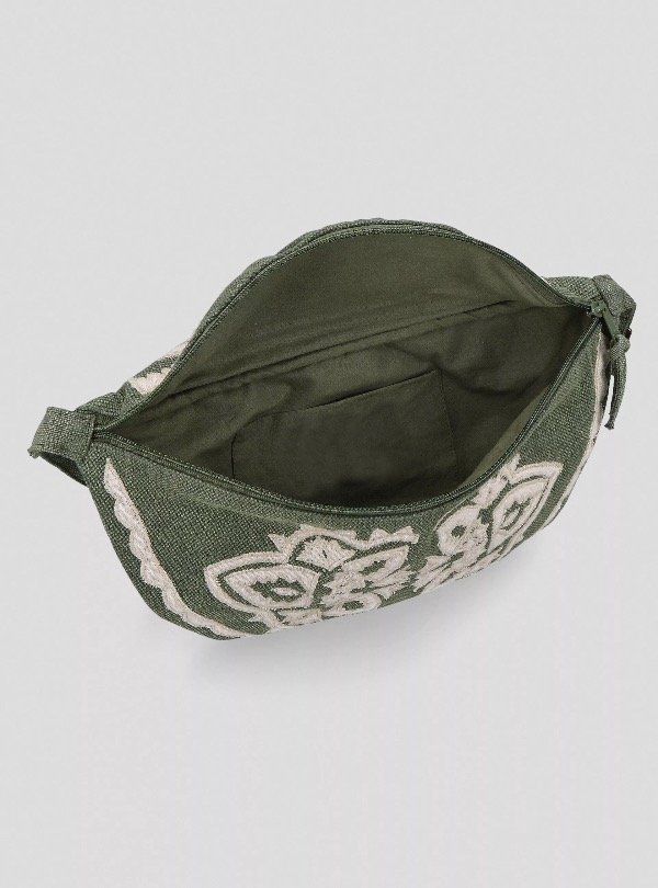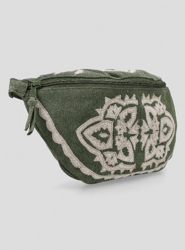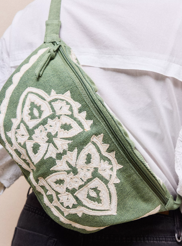 Riñonera verde de algodón con diseño bordado en blanco y beige.
