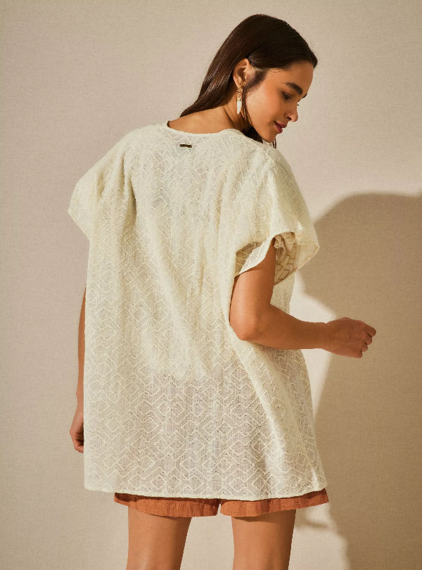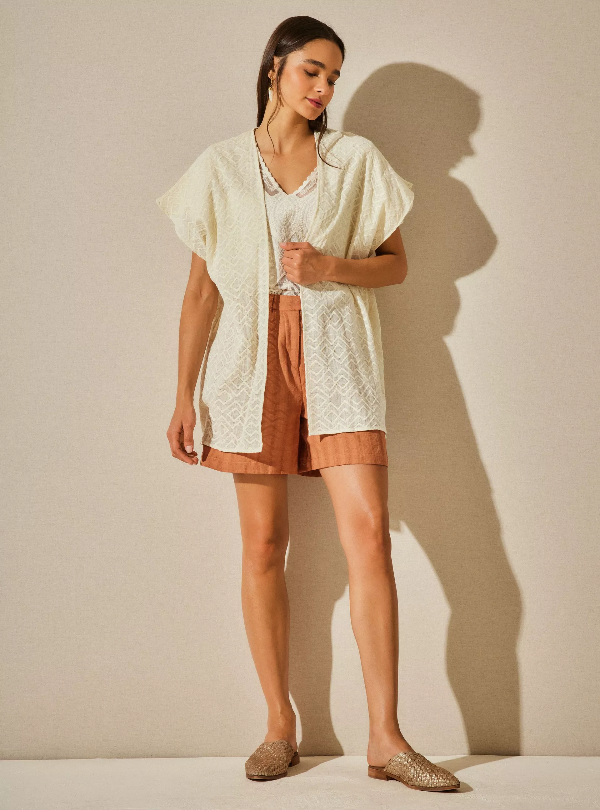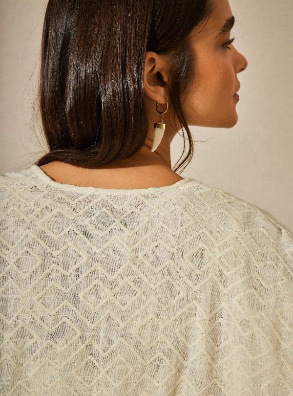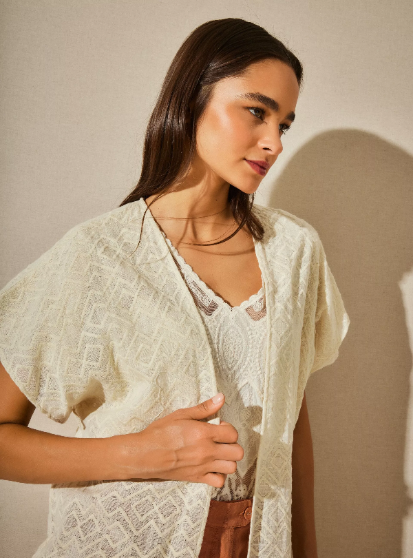 Kimono/ Chaleco Tejido color crudo con figuras geométricas.
