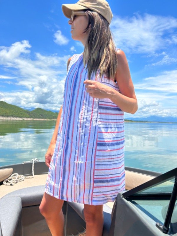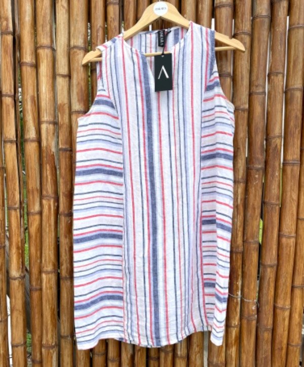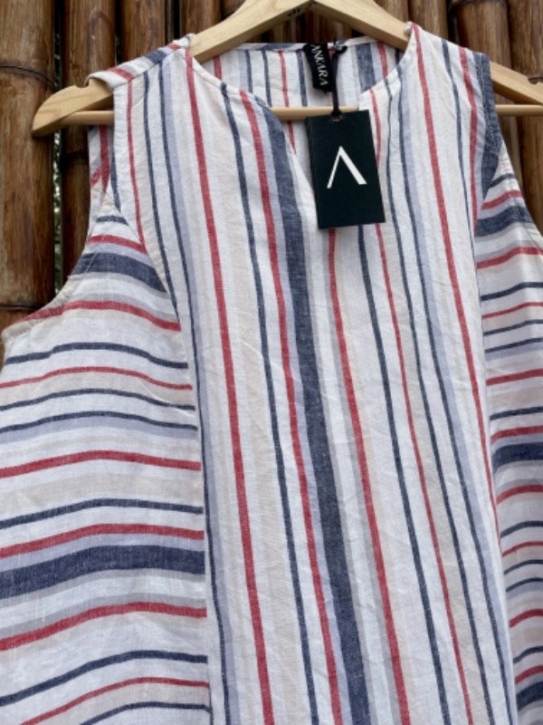 -Estampado de rayas azul, beige, blanco, rojo y celeste.