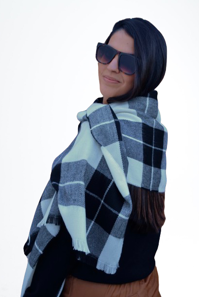 Bufanda tejida cuadriculada en tonos blanco y negro.