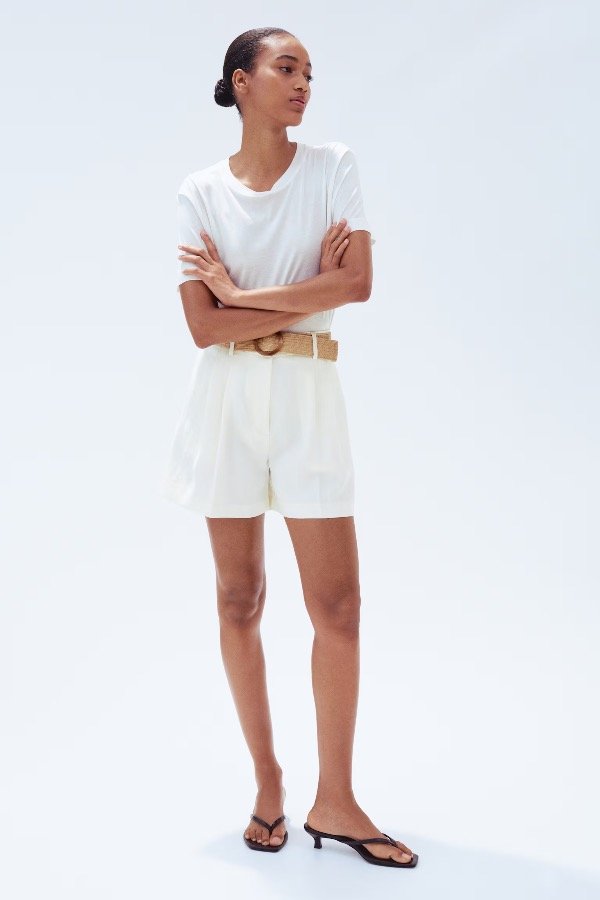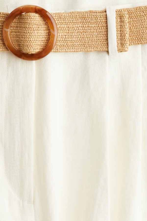Short amplio sastrero de gabardina con cinturón de rafia. Color blanco.