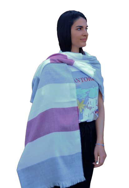 Bufanda tejida a rayas en tonos rosa, gris y blanco.